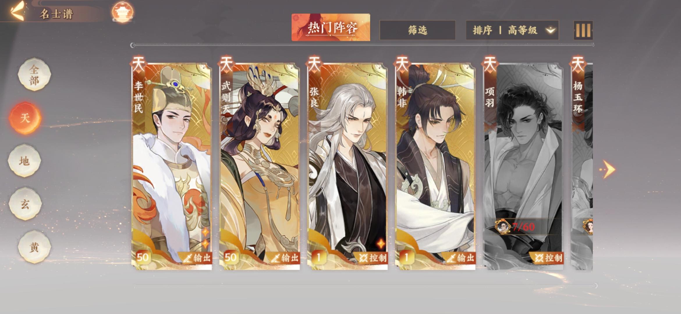 我是武则天开局,后面抽到了李世民。李清照池子歪到了韩非。然后签到领的张良。因为另外两张天卡对我来说没啥大用所以就没养。