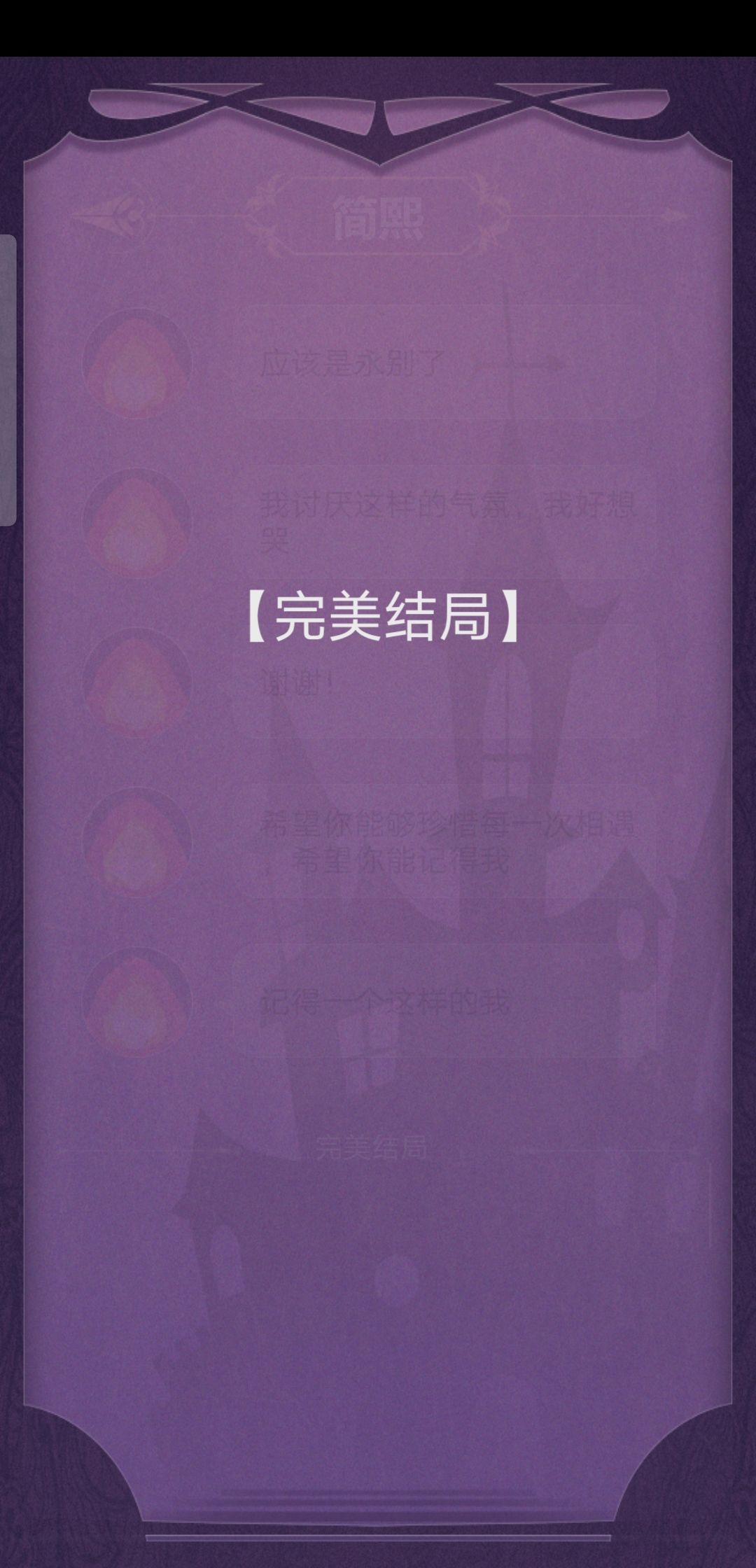玩了三次达到这个结局,不愧是我。游戏还不错,挺新颖的,但是每一次死亡后重新开始我个人觉得很有点枯燥,要是能出线索条,出结局后玩家可以在线索条上选择想更改的线索点再进去就好了,就不用重复一样的步骤。