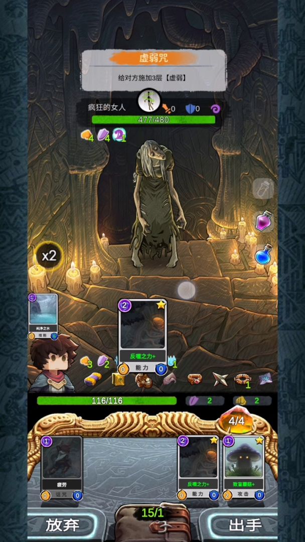 第三关就要注意使劲拖回合回血。尽量满状态。精英怪又掉落了金卡,但是不能拿。月湖姐姐又送了一张反噬之力。秘器拿到了破烂盔甲和女巫鼻子。