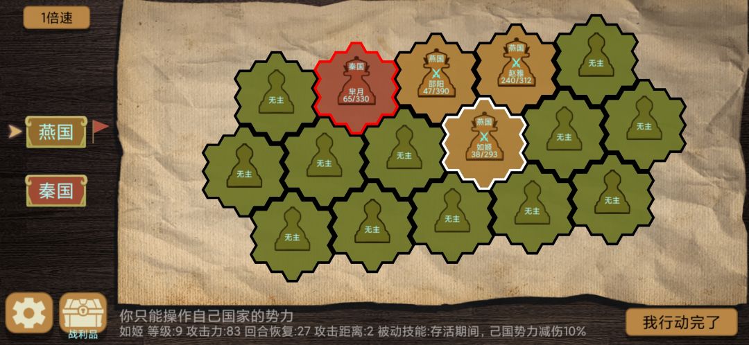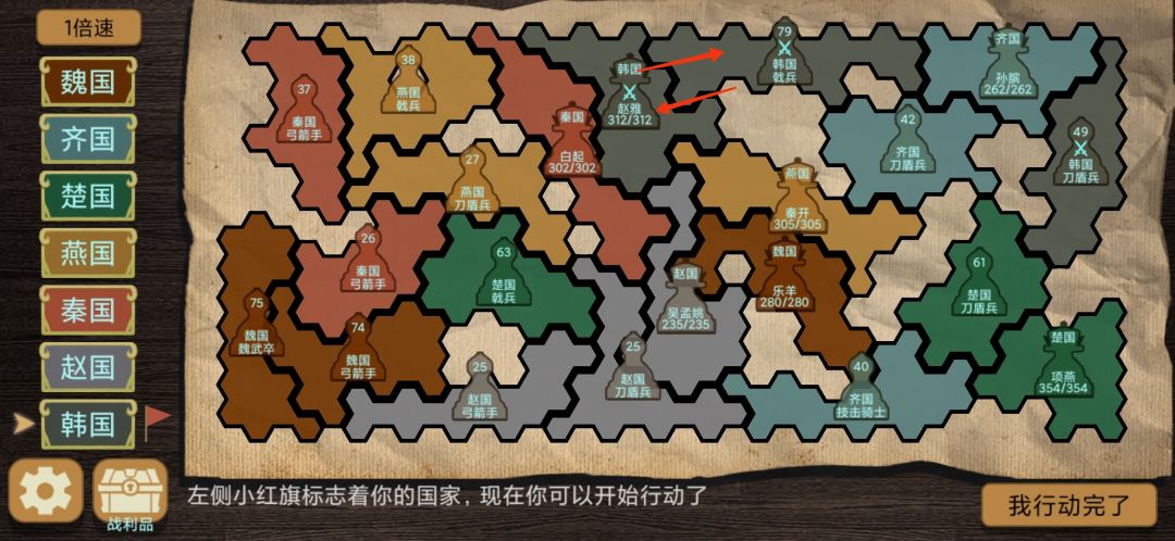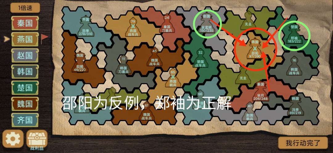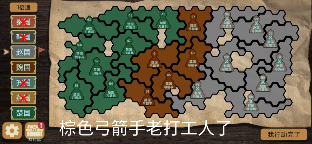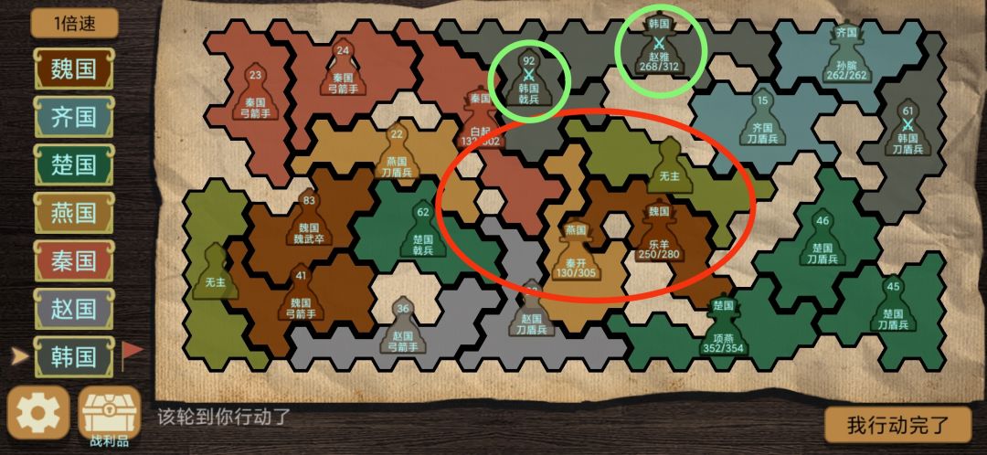 12.反馈ai有时原地不动,可能是bug,被我注意到的有两局的韩国强弩手及远程将领无任何操作连续跳过两回合(有可攻击的且无反伤的目标),有一局齐国的刀盾兵无操作跳过两回合。(如图,有接壤的可占领的无主之地)