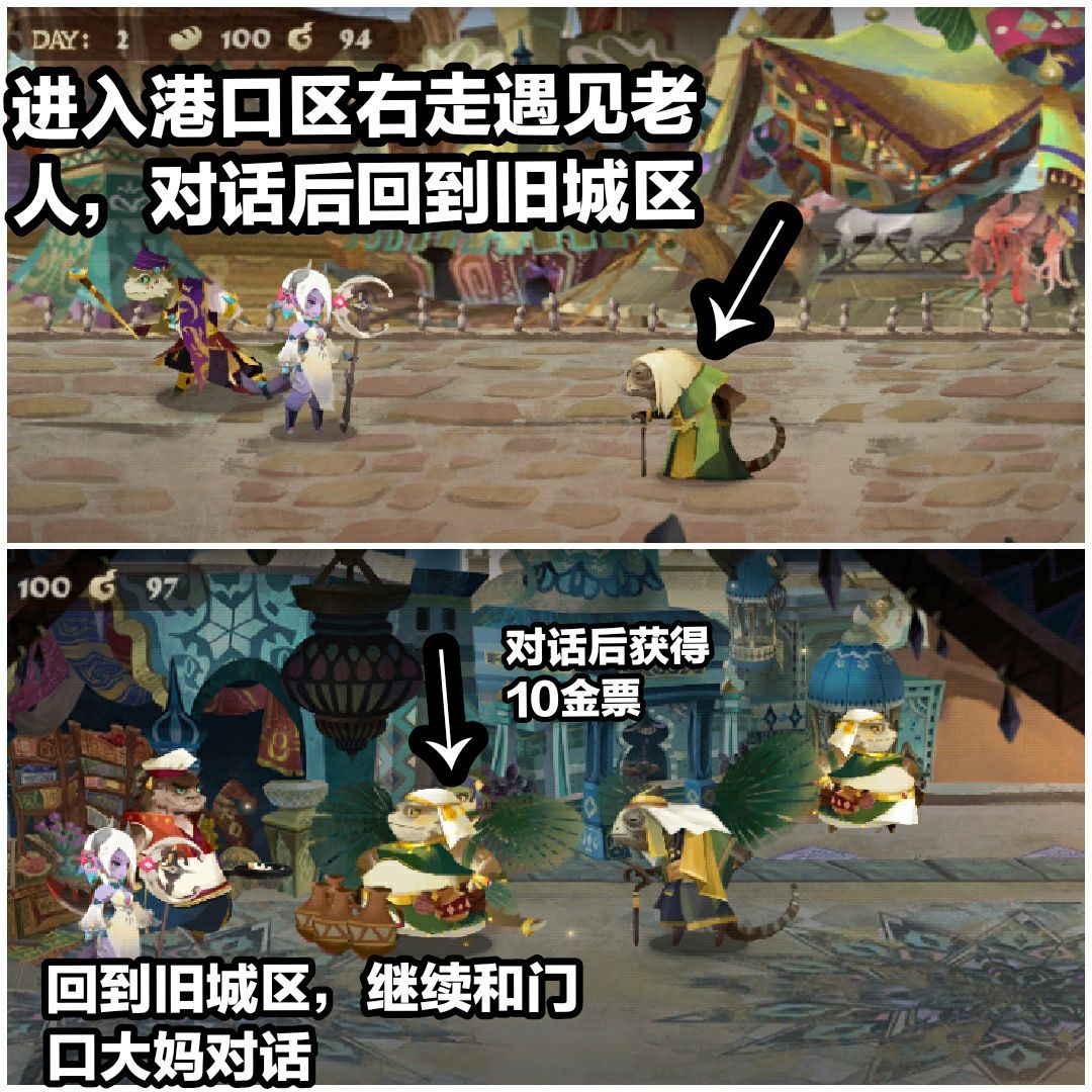 与举牌蜥蜴对话→右走至港口区入口处,与旁边的大妈对话→进入港口区,右走遇见尖酸老人,对话→回到旧城区入口区,和刚刚的大妈对话(10金)→左走遇见老人,扶起来,战斗(胜利后获得10金)→左走进入高山区,再返回旧城区→遇见举牌蜥蜴,对话(获得10金)