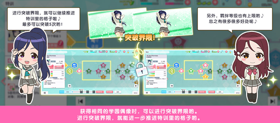 如果招募到了相同的学园偶像,就会自动进行【突破界限】哟!突破界限后能让学园偶像们更好地成长,也就是推进【特训】里的格子,这可是让学园偶像们能力值突飞猛进的小诀窍!