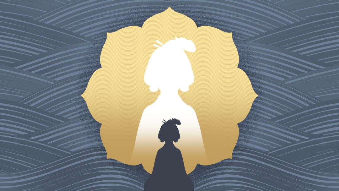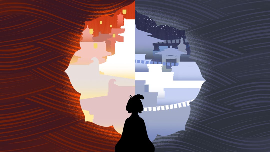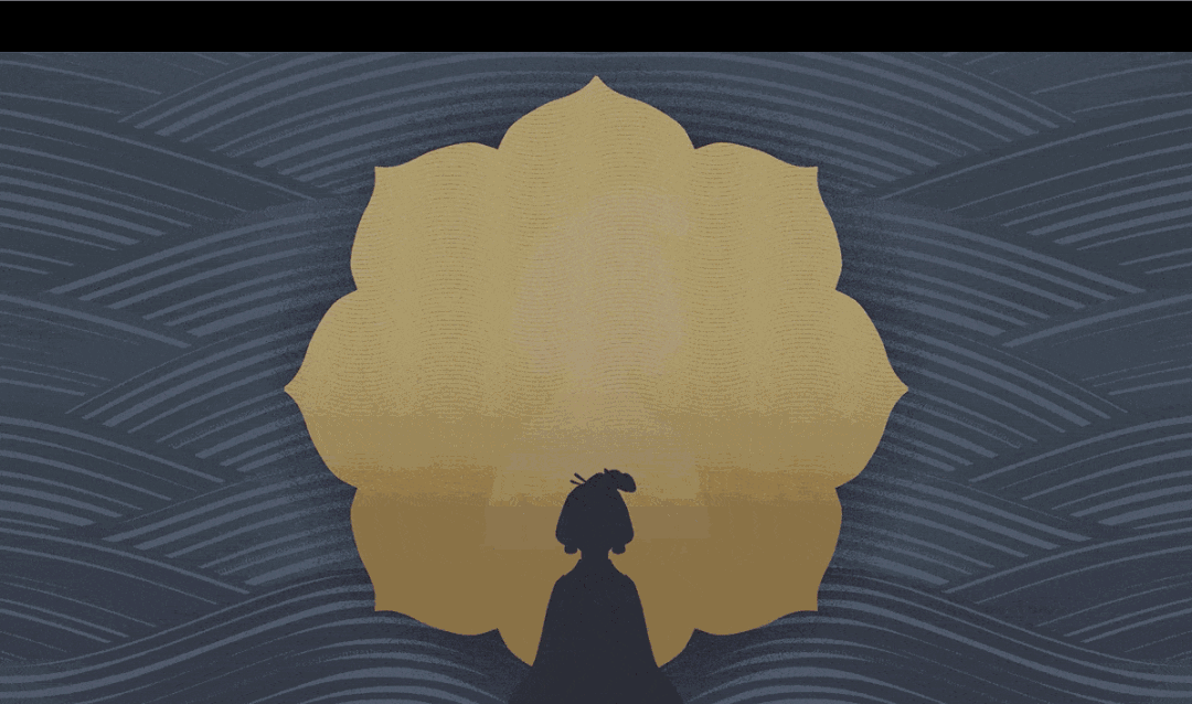 说到章节连接,这周我们1米88的原画三千同学为章节的衔接设计了转场,设计的想法来自日月山的传说。相传日月山是成形于文成公主摔碎的“日月宝镜”,基于传说,三千同学试图以写意的方式来还原故事中照镜的场面。