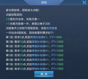 在主界面右下角竞技场每周刷新的奖励中加入PT值奖励,并大幅降低领取需要的点数