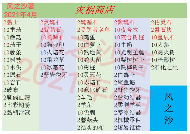 风之沙:灾祸商店兑换一览表
