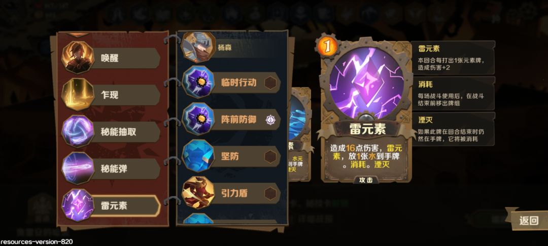 雷元素(伤害)使用之后会变成水元素(0费加1能量),水变风(治愈),风变火(烧伤),火变金(叠甲),最终循环为雷元素。第二轮伤害会增加,治愈烧伤叠甲都会增加。我把能量攒到8然后一张卡一回合把boss打残。虽然启动的慢了点,但是真的是太强了,一张卡把残血队伍拉满,把boss打残然后烧伤就送boss上天。。。。。卡组一定要精简,不是越多越好。