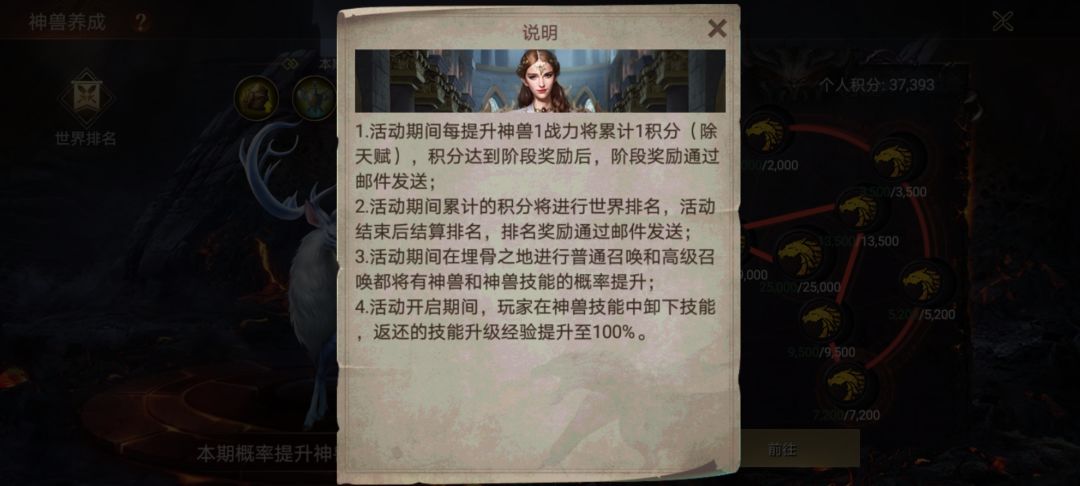 活动期间,有个技巧,你可以把所有技能都拆下来,主升几个技能。因为前期学习的神兽技能涨的分数不多,全部卸下主升几个能将主要技能都学很高,可以多拿一些阶段奖励,之后再拆回去即可。