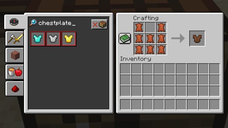 想要一套自己胸甲?很简单!拿出八个皮革,金锭或者铁锭,再或者钻石,然后用这些材料填满工作台的3x3网格并把顶部的一排的中间一格留空来让你的头能伸过去。之后把成品胸甲穿在身上就行了。告诉过你很简单的。如果你找不到任何这些原料,你可以从僵尸、骷髅、卫道士或者掠夺者身上偷一个胸甲,也可以从尝试从宝箱中找一个出来。村民有时也会出售胸甲。