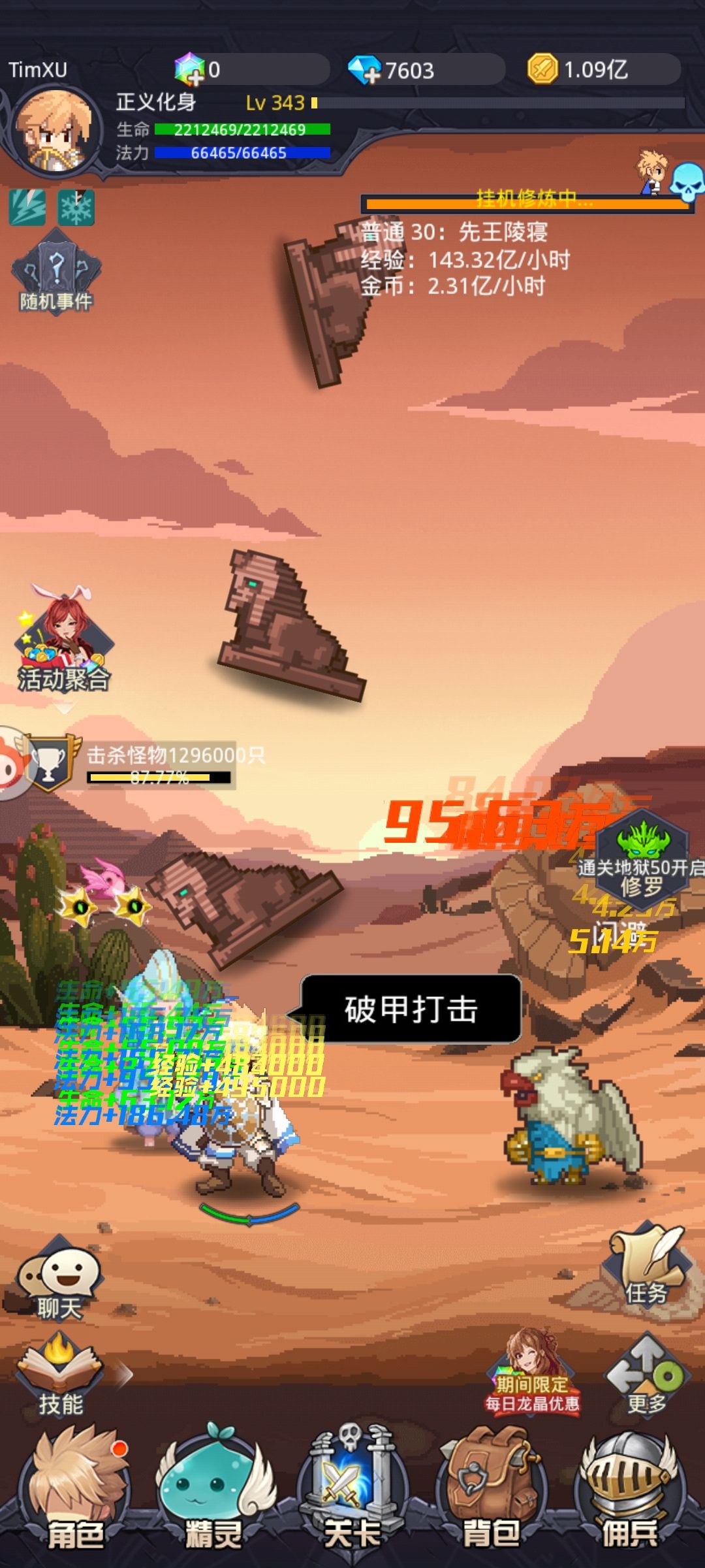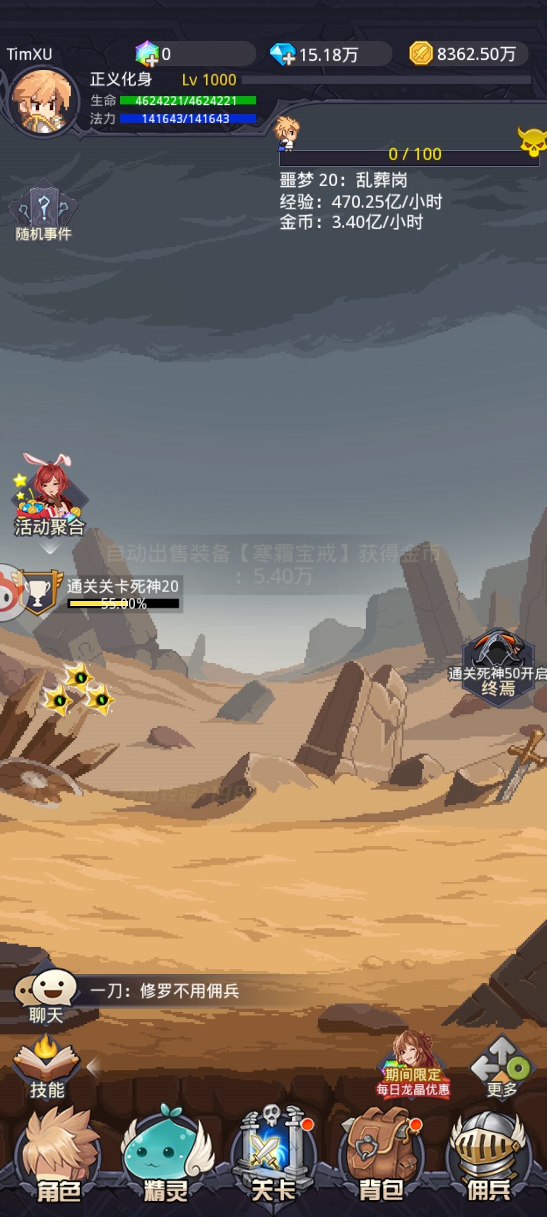 所以说不要着急挂机挂机挂机。那些叫你们磨血怪皮往后推图的,一定是坑你们的。打不动请勿随便推图。继续挂机。当然你也可以在线挂,在线卖掉落的垃圾。那样收入更快,但是你的手机一定会很伤。