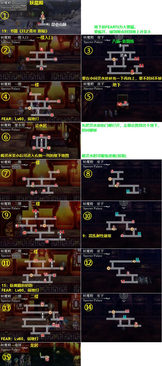流程:A→B→D→喝灵水→E→F(破坏贝壳)→G→J→K→喝灵水→K→L(破坏贝壳)→宝箱15(妖魔殿的钥匙)→M→喝灵水→N(破坏贝壳)→O→BOSS