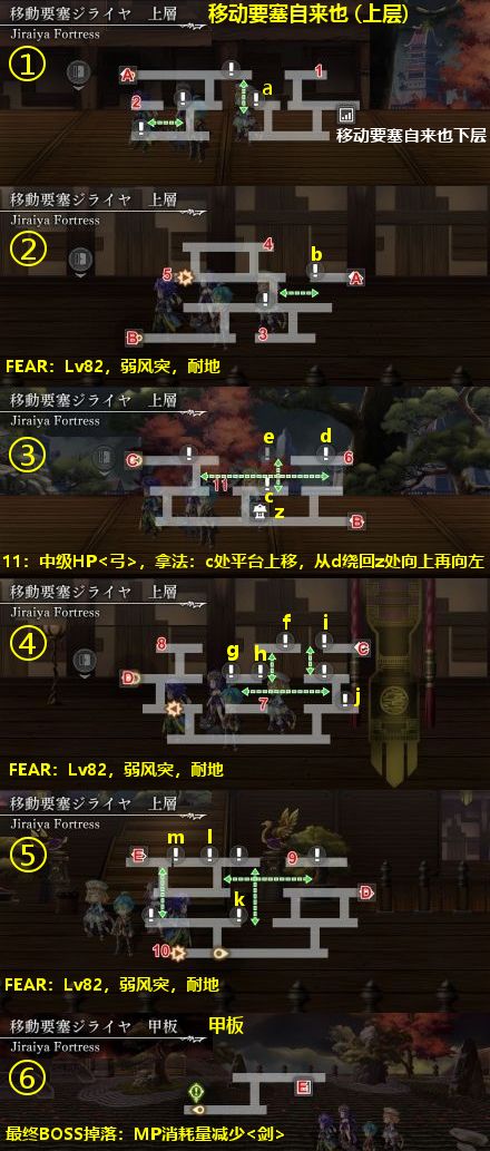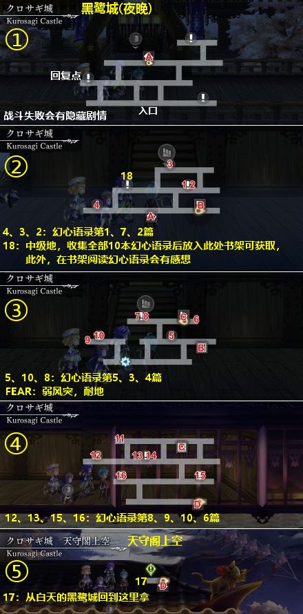 宝箱:1~18,其中2~5/8/10/12/13/15/16是幻心语录(共10本),全收集后放入图②宝箱18处的书架,可获得大地之力。宝箱17的拿法:打完BOSS后从白天的黑鹭城回到这里。