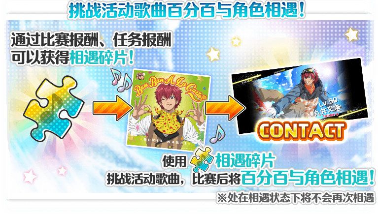 活动时间:4月11日 维护后~4月16日 22:59》限时开放!并额外开放三首活动曲《每天都是Happy New Year》、《网球王子真好》、《W-rainbow》,消耗活动道具「相遇碎片」/奖牌 挑战活动曲目完成挑战后可100%开启限时“相遇任务”,完成“相遇任务”即可获得大量PT点数。