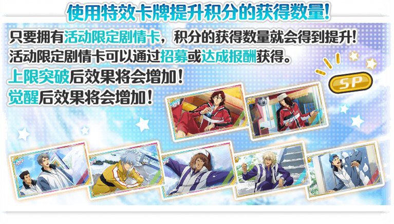 在本次活动中收集活动PT,即可根据PT获得卡牌及休息室道具等奖励,活动结束后还将根据活动排名获得更多豪华道具。