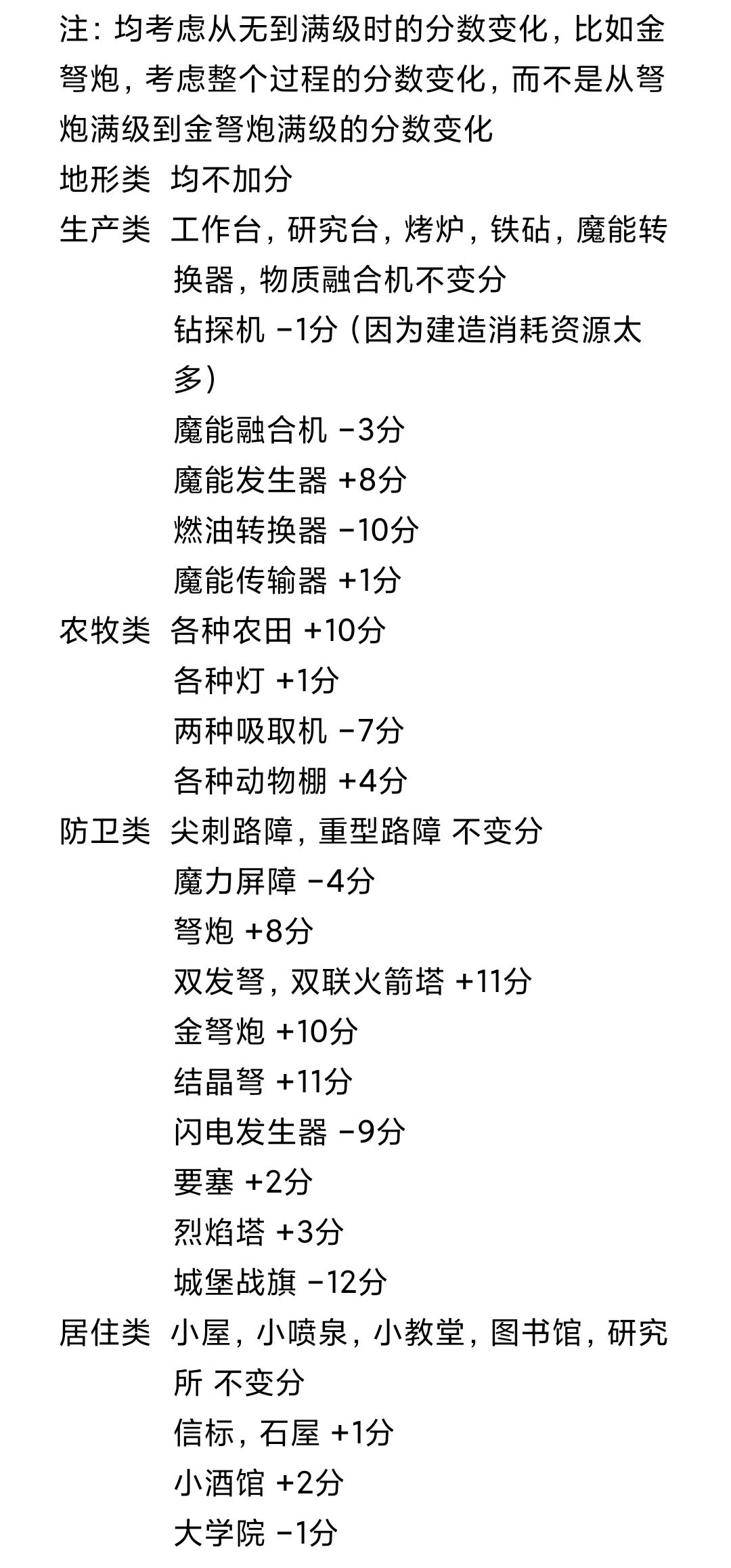 应游戏群里群友邀请,在游戏中实验了各种建筑的分数变化,结果如下