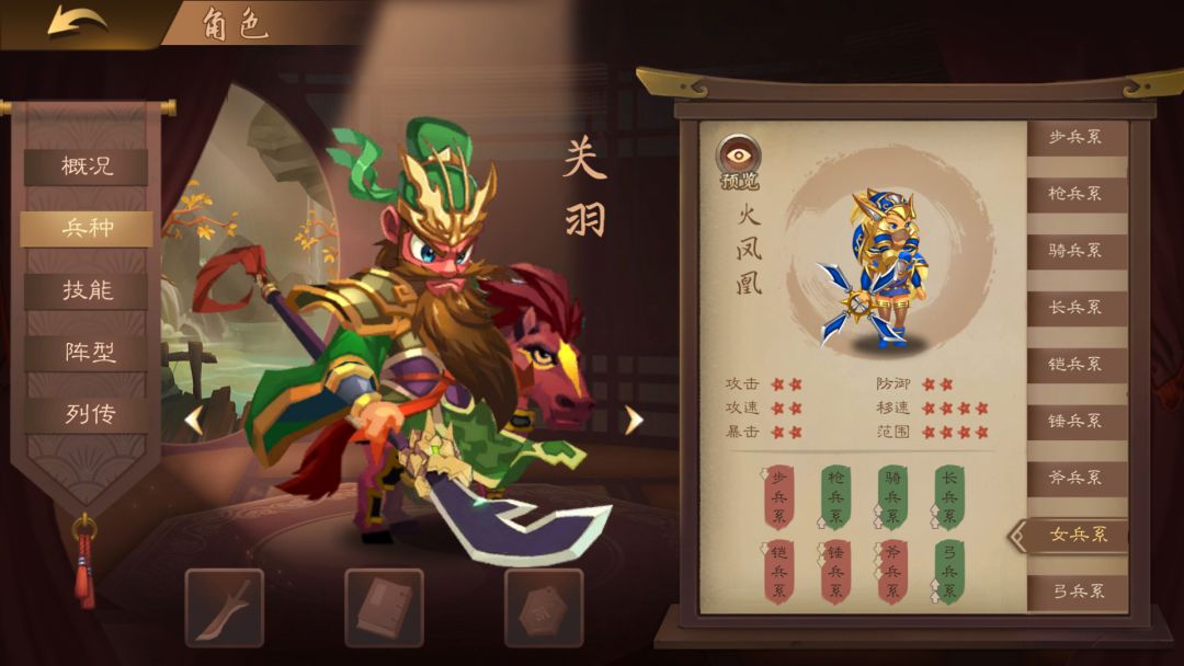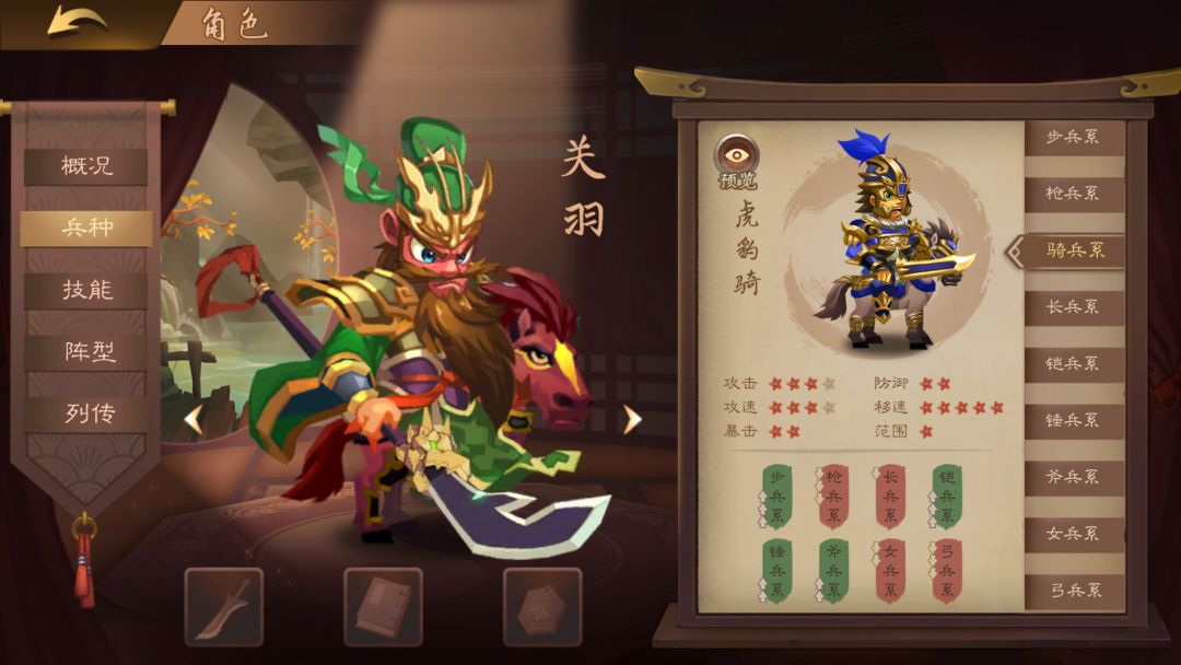 骑兵:机动力高,非常适合游击战术,灵活运用可对敌方武将形成包围,防御偏弱。