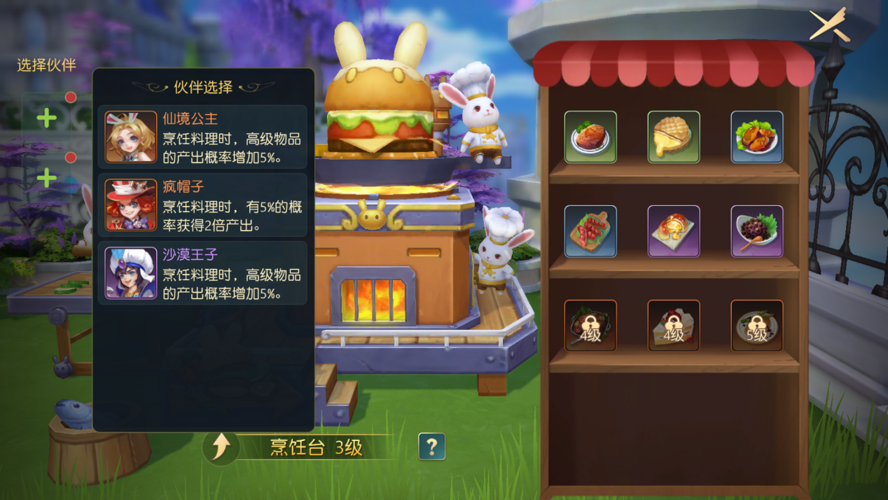 与炼金台一样,所获得的产物可以通过选取伙伴协助而一定概率增加产出,并且有一定概率获得增加伙伴好感度的幸运物品,不同的是烹饪台还有能增加幸运物产出的伙伴加成。