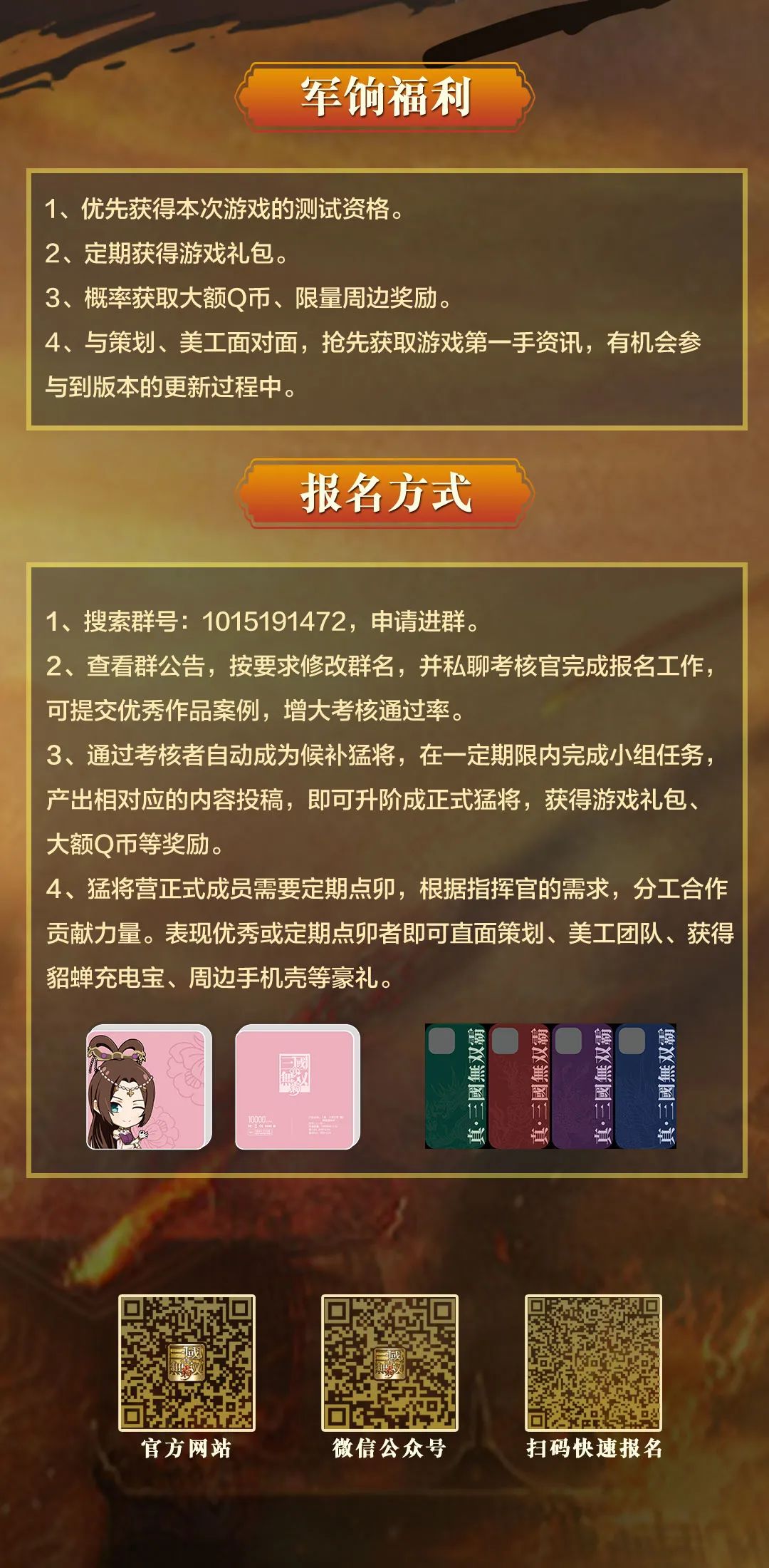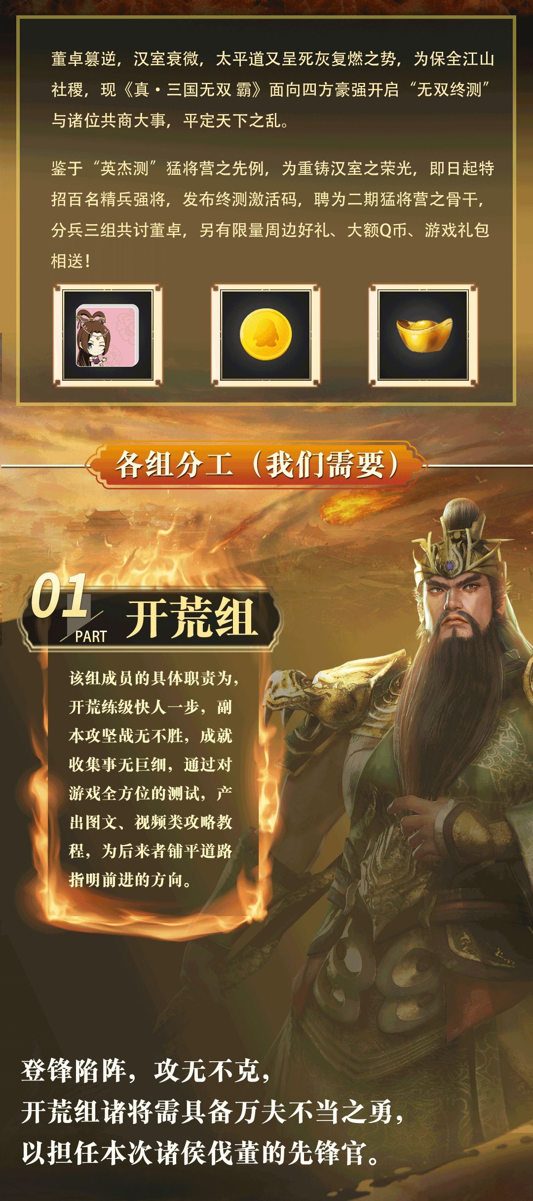 只要你有热忱、有毅力、有专长,就能加入《真・三国无双 霸》猛将营,与策划、美工面对面,抢先获取游戏第一手资讯,更有机会赢取限量周边好礼。