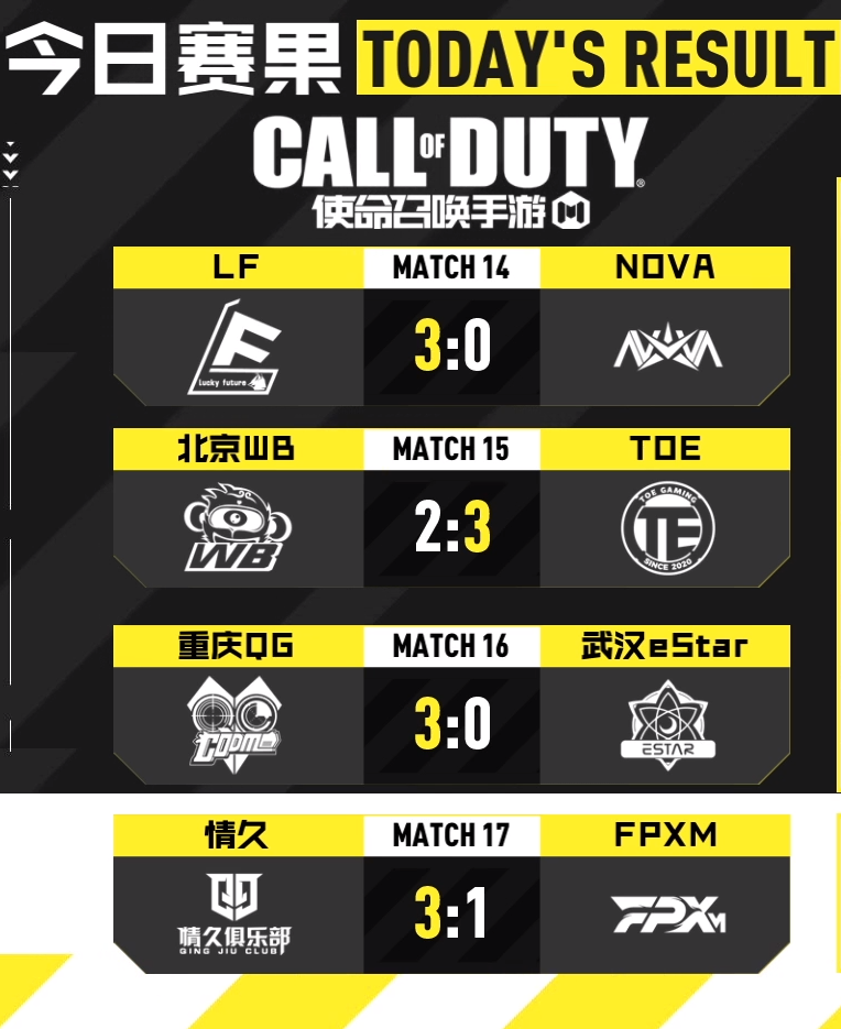 至此,4月10日的比赛已经结束,今日的比赛中,各战队为我们带来许多精彩操作。FPXM与情久之间的“世纪大战”也以情久的获胜终结,今日的比赛看点十足,不仅有重庆QG小狐狸爆破模式1打3的精彩操作,迷弟在对战北京WB时,残局1打4的操作更是令人拍案叫绝!4月11日15:00,使命召唤大师赛常规赛第二周第四日精彩赛事即将打响,届时各战队会有哪些表现呢?让我们一起拭目以待吧!