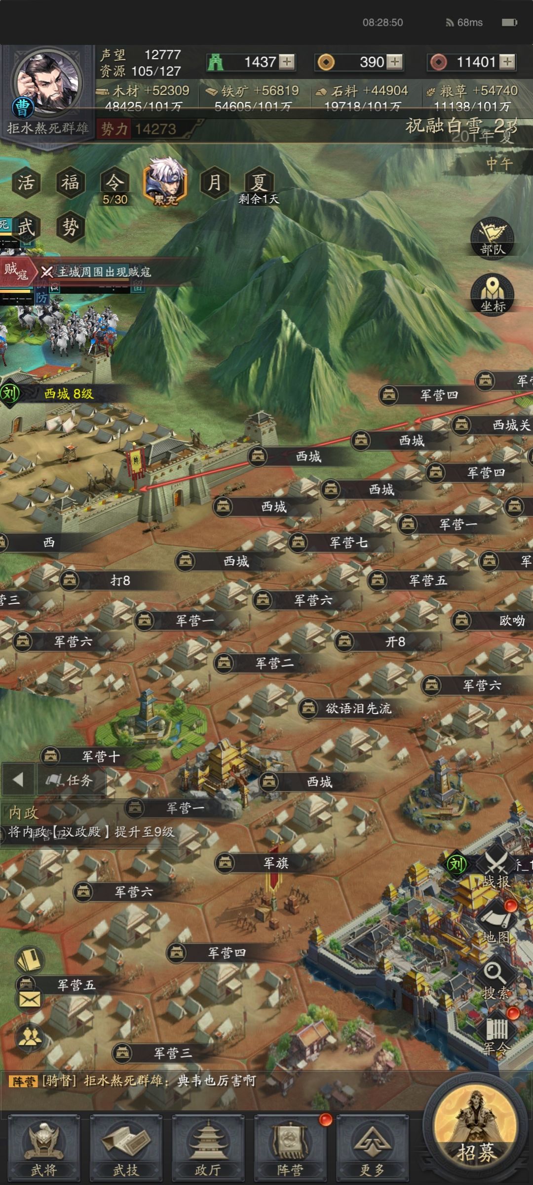 上面这个图是魏和刘的人在西城互相看着,谁也不知道谁会先打出去。不过知道的是那个先打优势就没有多大。