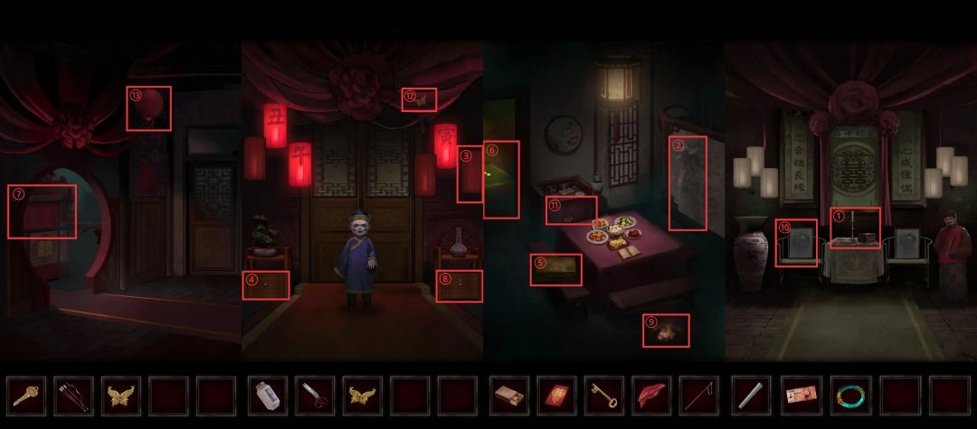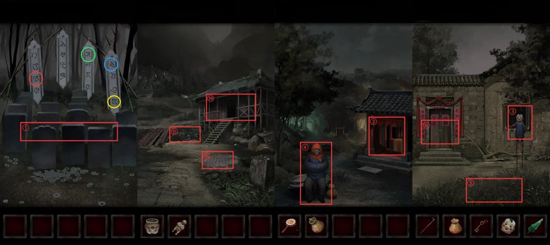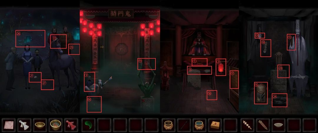 用刚得到的信息调整无常殿的⑮钟表🕰️,重新拾回纸符人并再再次放回供桌。剧情结束后捡起⑯地上的小方块,将其安放在⑰戏台上,根据供桌上的《阴世录》最后一页的信息摆放好木块。