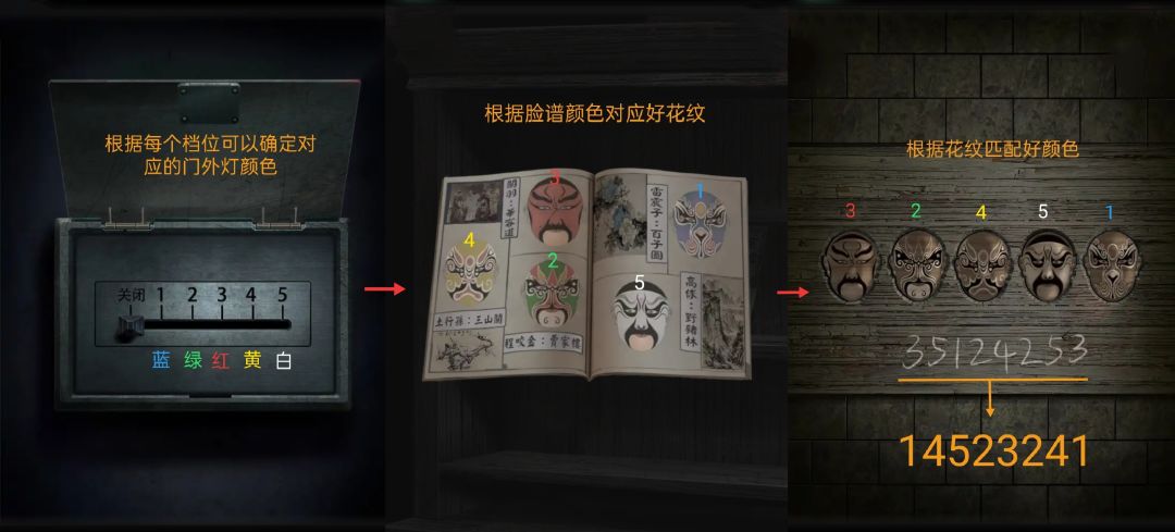 从①门卫室窗沿拿到信封✉️,透过②草丛的地灯💡可以看到信封里面的信息【856714】,以此打开灵棚桌下的③盒子📦,拿到火柴。