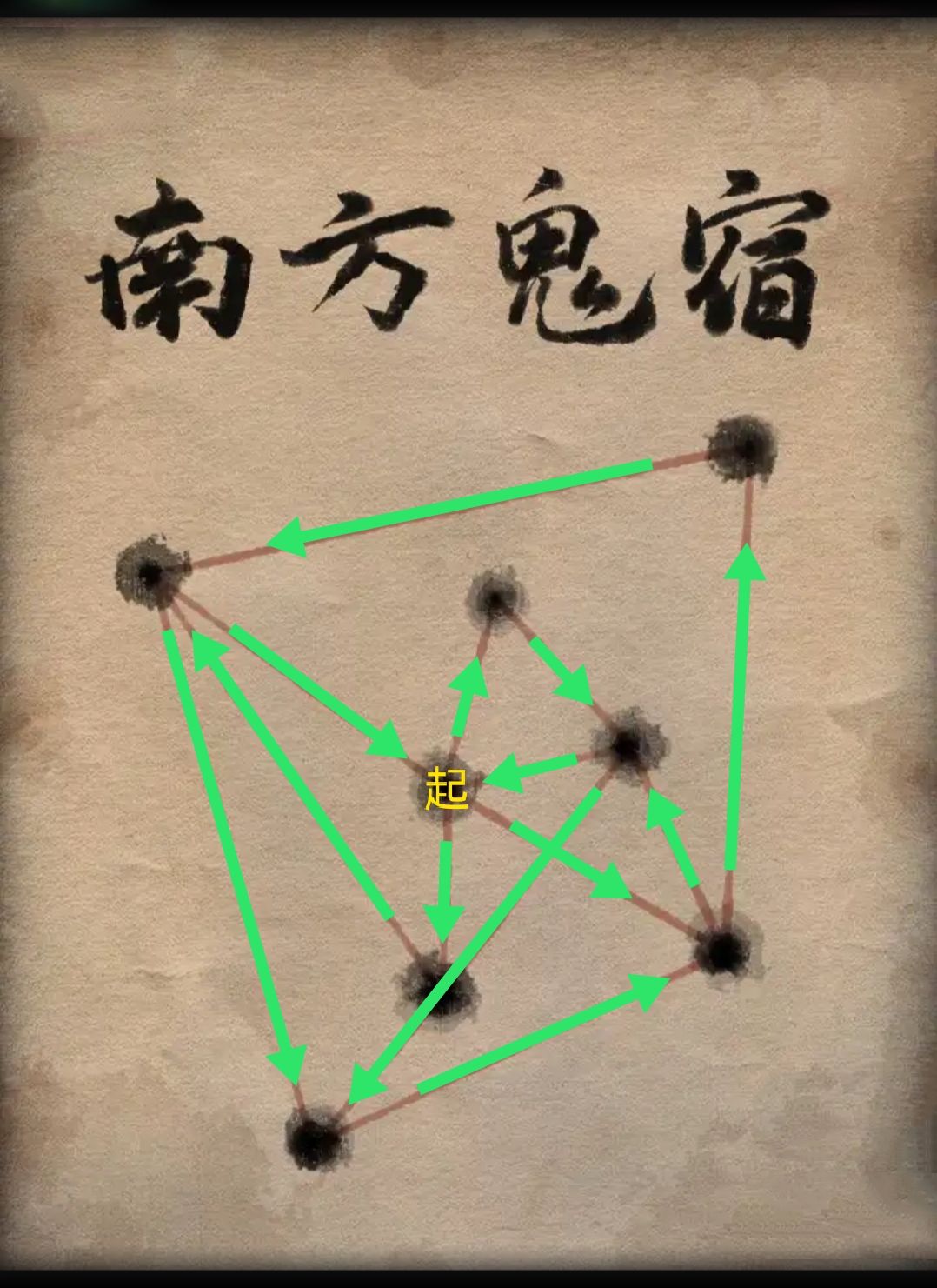 回到庙门口,在⑥左侧方桌上方抽屉里拿出毛笔🖌️,随后用空香炉在⑦水缸盛满水。进入城隍庙,把包中的符纸人放在供桌上,毛笔、墨块及盛水的香炉放在⑧案桌上,晕开墨并解开星宿图后,跟着小孩👶🏻前往左门外的鬼门关。