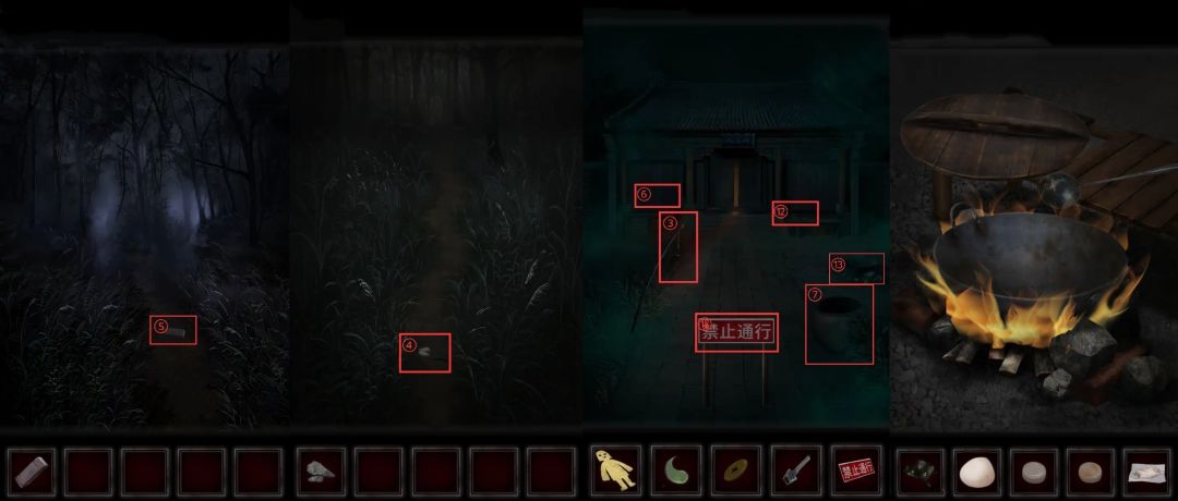 进入城隍庙里从①供桌上拿到空香炉后,把②灯笼🏮挂到门外的③杆子🦯上。借助灯光进入左边小径,捡起路上的④燧石及⑤墨块。