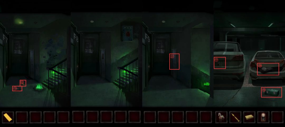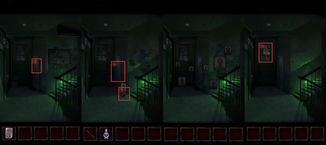在经过三楼的时候从⑩门上拿到门神年画,经过四楼的时候在⑪苹果🍎上拿到红色的奇怪的零件,到达七楼在⑫地上捡起空白符纸。