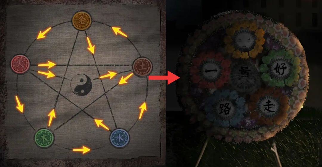 根据④遗书📜最后一页上八卦图案【☰☱☲☳☷】转化笔画为34456,解开⑤小区门锁密码。进入楼道后点击⑥电梯,得到符咒,上楼梯后退出,拿着符咒与⑦道士交谈,随后按照⑧花圈上的颜色摆好卦象。
