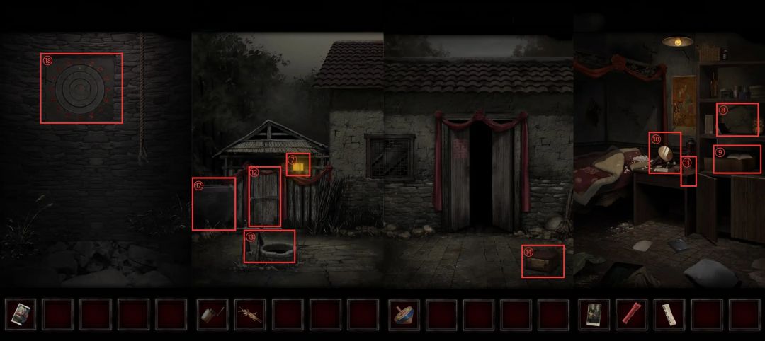 把⑨架子上的纸条放到梳妆台上的⑩镜子上,对称后得到信息【4648】,离开前带走梳妆台上的⑪红蜡烛。用刚得到的信息打开⑫柴房的门,拿出辘轳头并将其安装到⑬井上。
