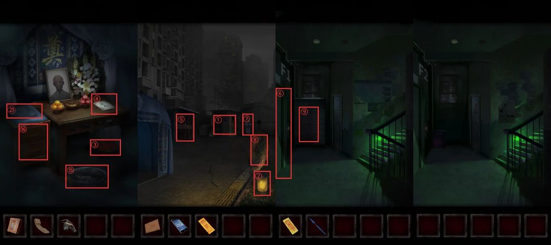 拿着钟🕰️回到老人灵棚,放到㉑柜子上后,进入大楼第九层,此时由于没有老人阻碍,走楼梯的话一直向上即可。将镇宅符和空白符纸贴到㉒门🚪上,再用贴纸弄好空白符纸的花纹即可。完成对话后本章结束。