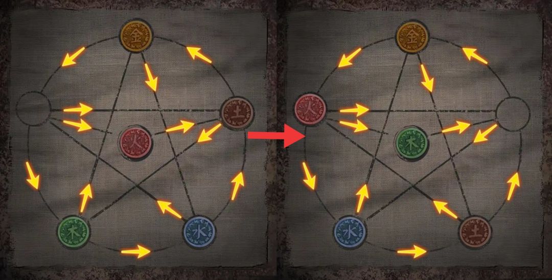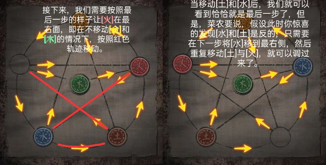 因此我们首先就是要让[木]在中间。也就是说[木]需要先在金的左下方位。那么在[金]不动情况下,就需要先移动[水],然后是[木],再然后是[土]。
