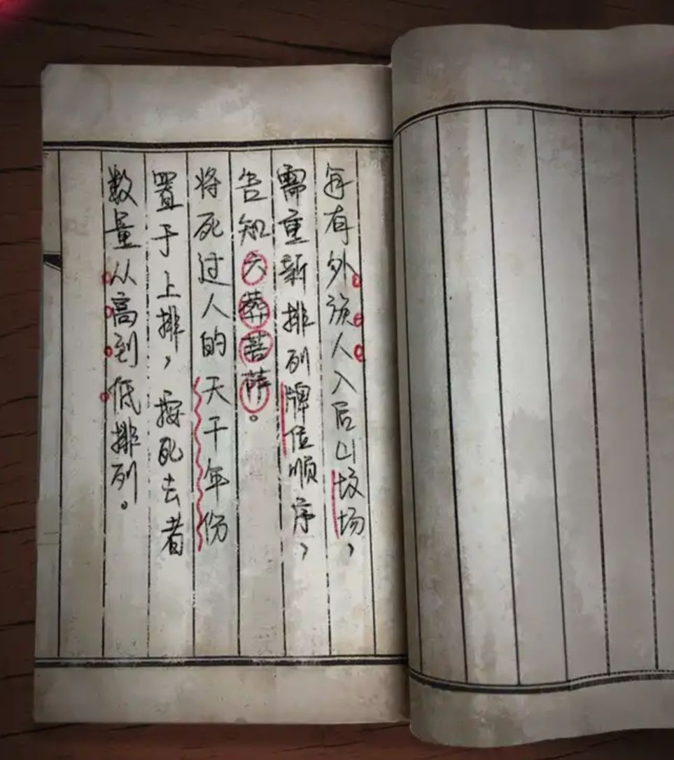 前往坟场,在①墓碑上得到信息【丁癸辛乙戊】,回到②祠堂后按照书📖上所讲将牌位从高到低排好,拿出拨浪鼓。