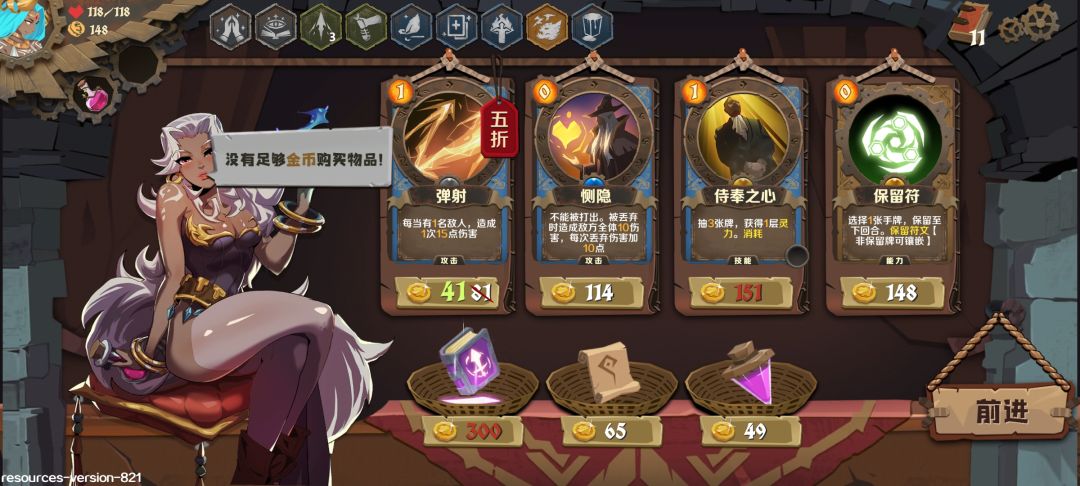 然后进商店不要先买天赋,优先购买侍奉之心之类抽卡多的牌(最好给它融合先机),免得没钱买卡。天赋没有要求,随便点点就行,可以点开局加能量、技能两次触发或者过牌加格挡都行。随从随便选,主要作用是加一点开局能量,好翻倍一点。