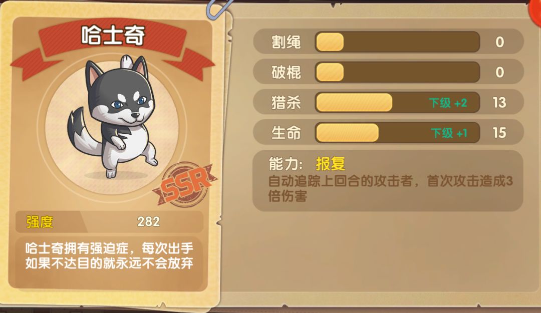 不过小编最喜欢的还是尚未入手的二哈,作为稀有度SSR的顶级宠物,哈士奇发射出的狼牙棒可以自动追踪上回合的攻击者,且你的首次攻击会造成3倍伤害,一举将对手的王牌宠物击落。因此在面对有哈士奇的对手时,轻易让自家的王牌角色出手就极有可能被定点打击哦。