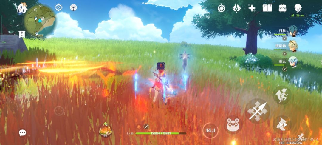 香菱风火轮期间,要普攻触发行秋水剑和重云附魔。