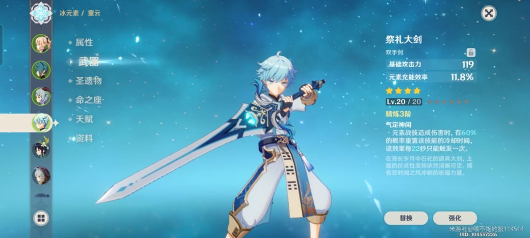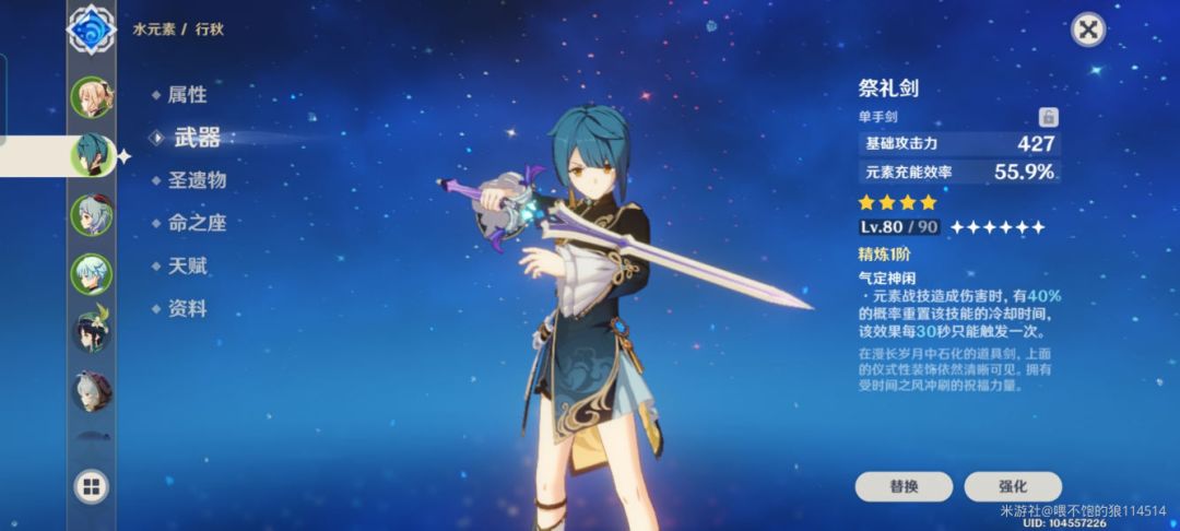 如果为6命充能不是问题,可以考虑绿剑匣里提升输出。祭礼剑是刚需品。没有祭礼的低命行秋是充不上能的