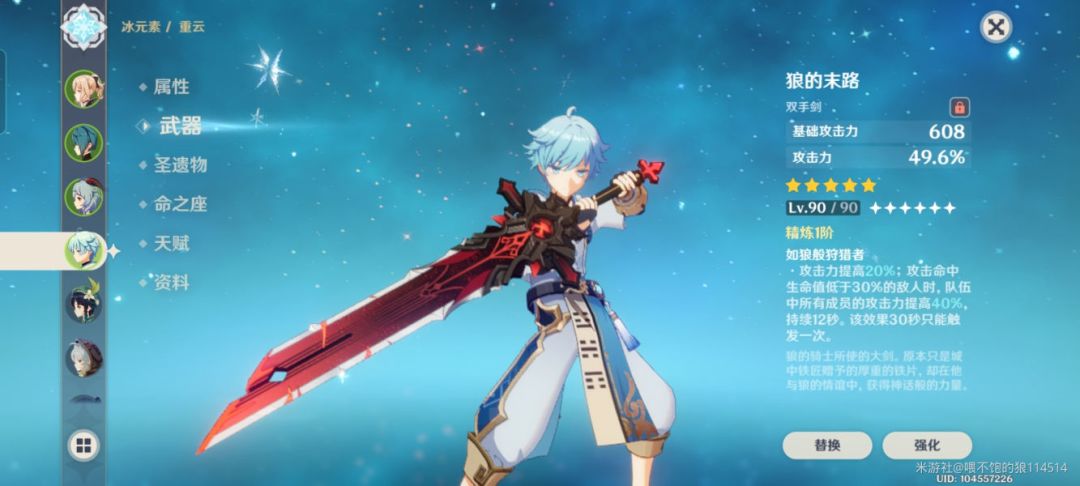 砂糖的武器带祭礼残章,没有祭礼带讨龙。圣遗物风套。头冠沙漏杯子都选择精通