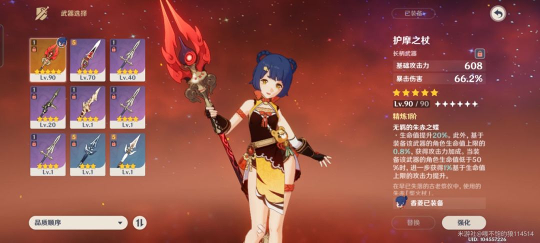 香菱武器首选护摩之杖,次选和濮鸢。没有这两把就天空之脊注意,如果带天空枪需要攻击沙漏。如果带护摩和濮鸢,而充能不够需要带充能沙漏