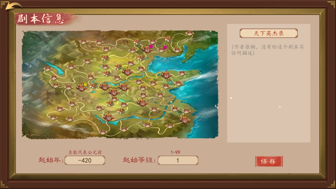 创造完至少两个势力后,便可完成创造剧本了,此时可以编辑游戏起始年(可以填负数代表公元前)、起始等级、剧本名称以及剧本描述。