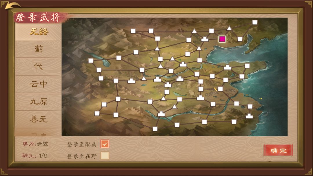 选择君主所在城池,下方选择登录至配属,这些武将即成为该势力武将。需要注意的是,因为不同城池有不同的驻扎上限,多选武将多于驻扎上限时,会登录失败。当然也可在这个状态下,将武将登录城该城池在野状态,在野没有上限限制。