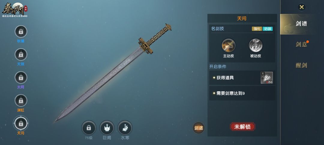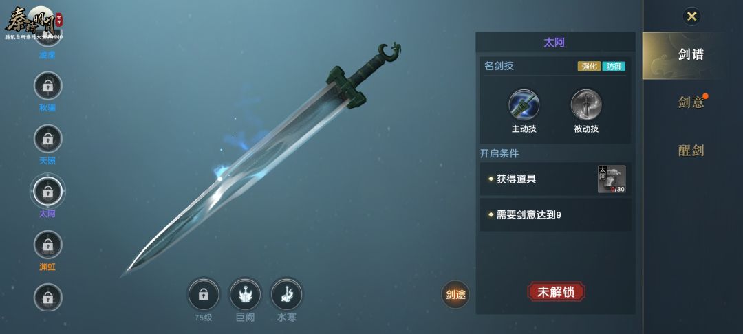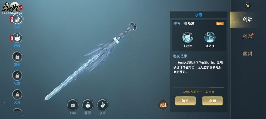开启名剑系统首先需获得水寒剑,而想要获得水寒剑则需收集千年寒髓、寒泉水、银丝、易水歌4件道具,这些道具可通过完成主线剧情收集。完成任务找到高渐离通过他的考验,即可获得水寒剑并开启名剑系统了。