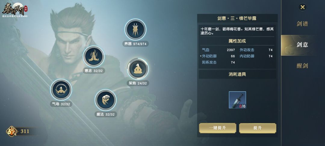 五个方面都升级到当前最高等级后才能突破至下一层剑意。通过剑意升级与突破可获得功防等多种属性加成,例如,提升意念等级可增加内功防御属性值。