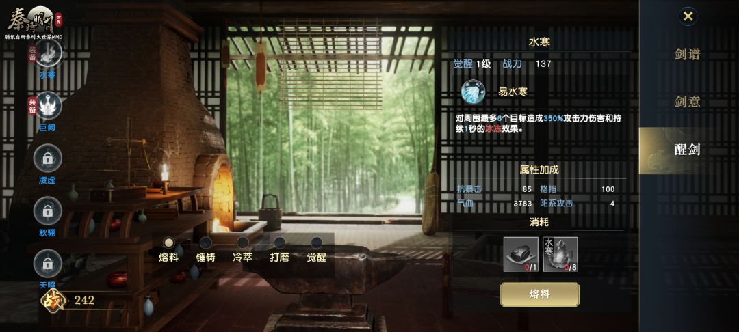 除了剑意还可以通过醒剑来养成名剑,依次经过熔料、锤铸、冷萃、打磨、觉醒五道工序才能完成一次醒剑。完成觉醒后可以提升名剑的威力。