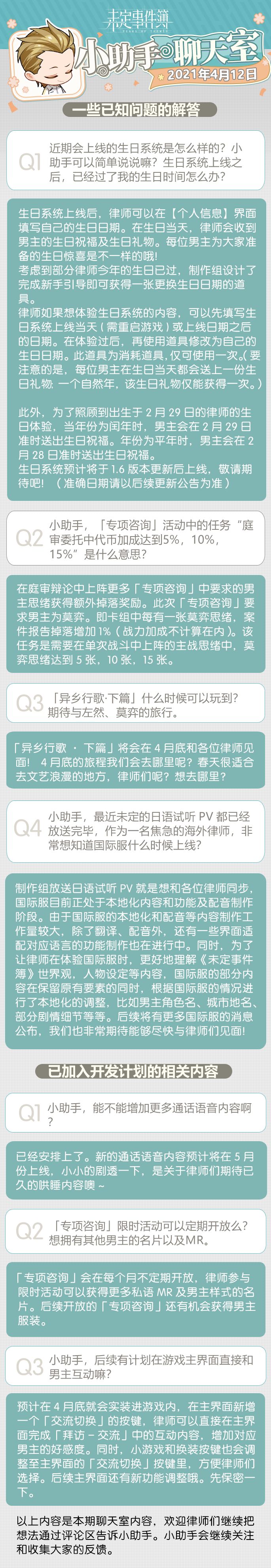 锵锵锵锵~忙碌的周一不能少了小助手的聊天室,最近小助手整理了较多关于生日系统及近期游戏活动相关的反馈,和制作组沟通后得到以下回复(还有toupao),感兴趣的律师们可以来看看~