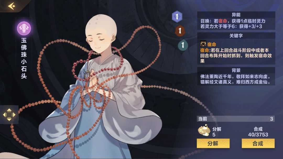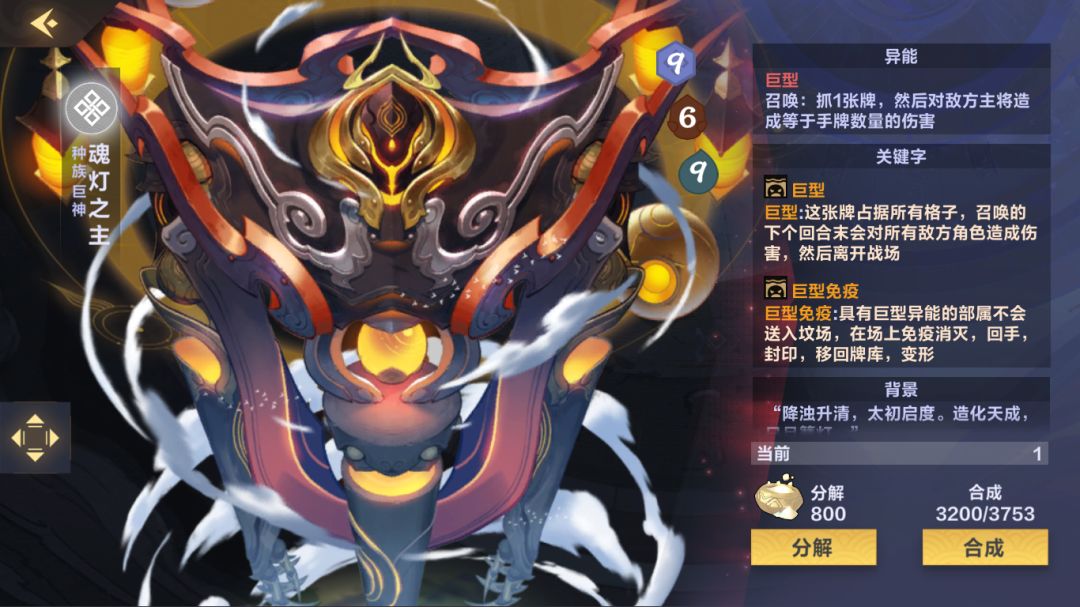 这张卡是我特别纠结的一张卡。大家不难发现我这套卡组里面很多高费卡,在10费的时候很难铺出场,打出配合。比如在10费的时候,只能上一张8费卡,那么手上的3费灵珠就不能打出去。有了这张卡减费,效果就能出现。但是这张卡很多时候又不能打出理想的效果,所以我只带了一张,一直在犹豫要不要带满。