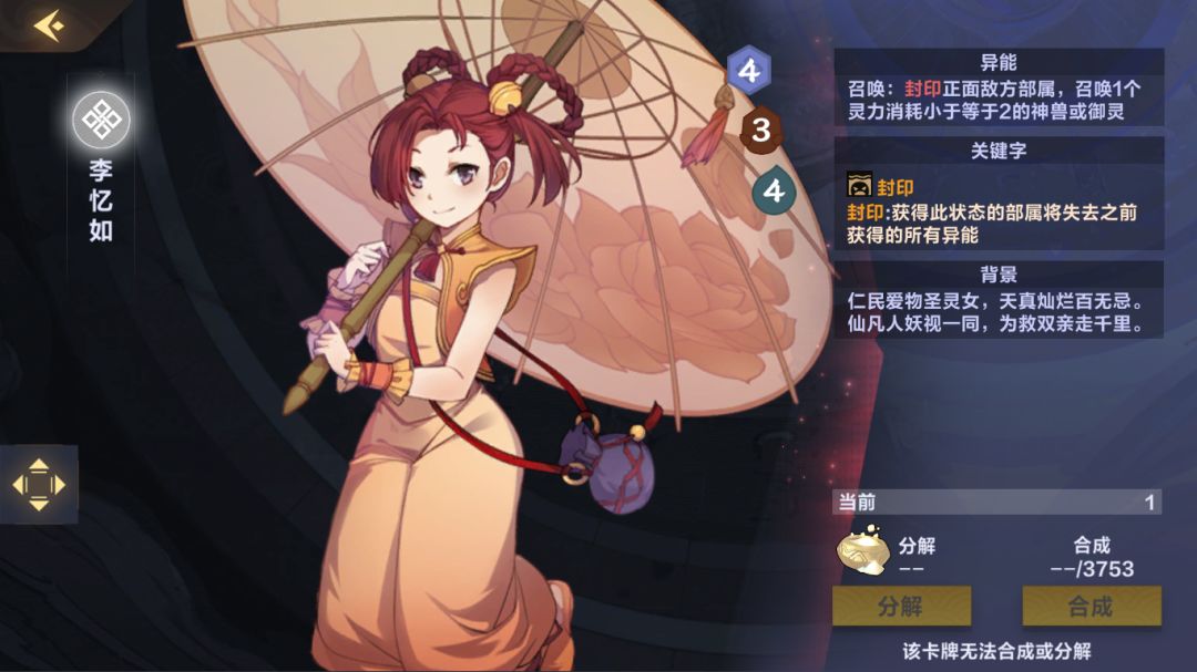 李忆如合服之后才有的卡,很好的一张控场卡。3费34带封印带召唤,前期能很大的缓解被快攻打脸的情况,保守能解对面两张快攻卡。