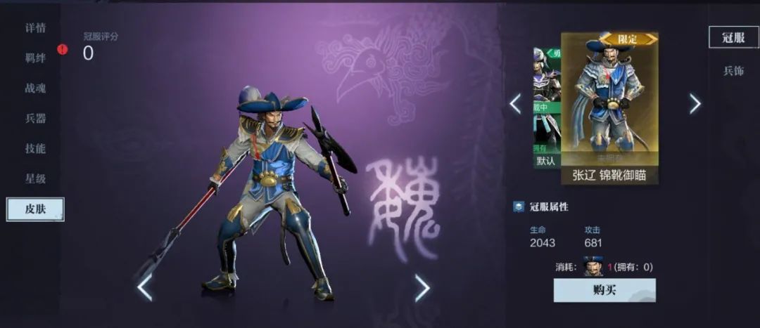 1、新增张辽武将时装蓝猫