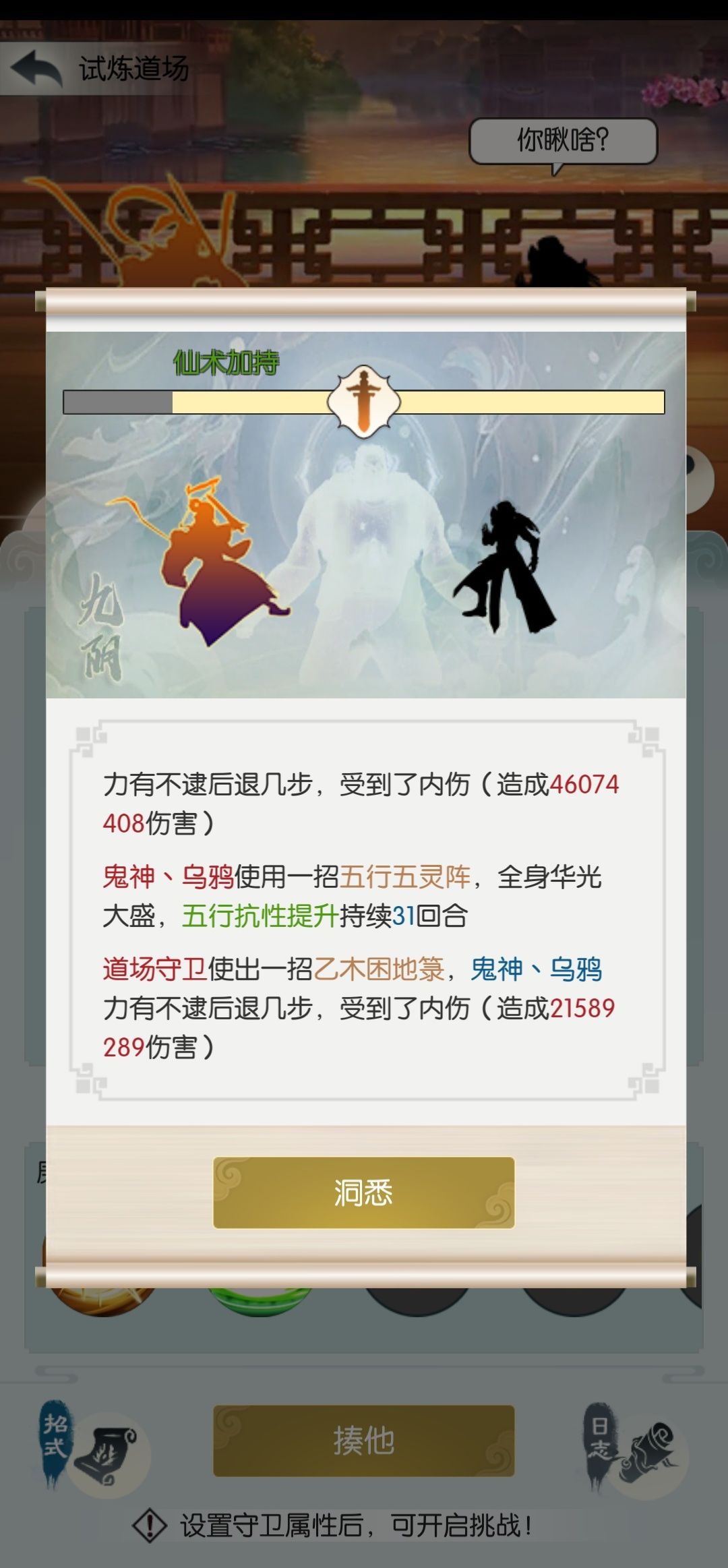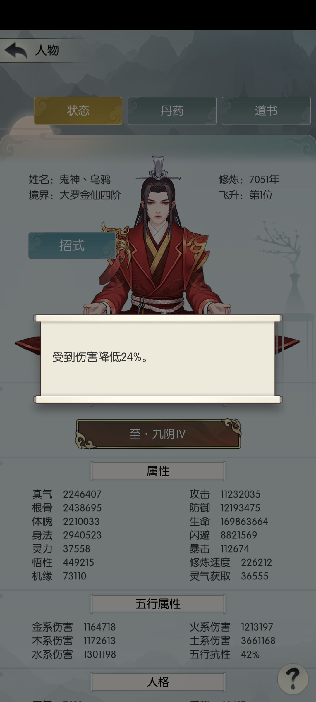 伤害公式=(攻击力*威力系数+五行伤害*伤害加成*(1-五行抗性)-防御力)*(1-境界压制-九阴减伤)