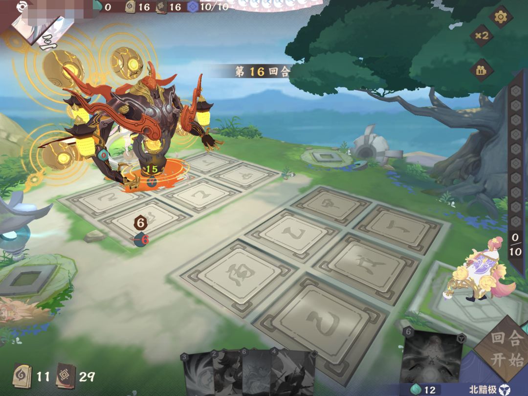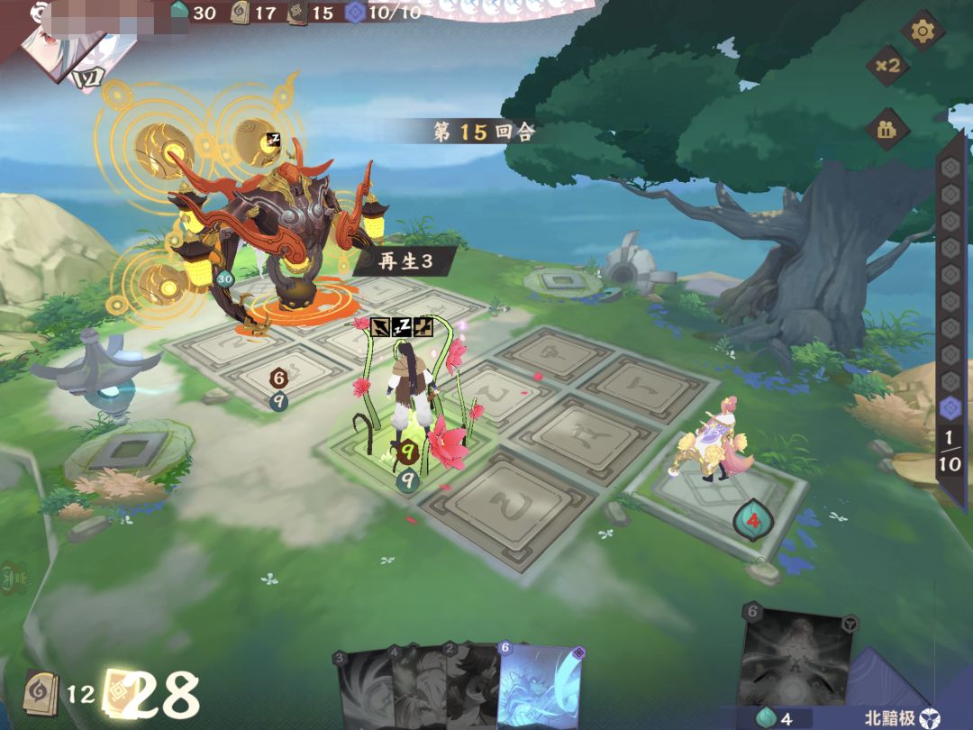 3. 还剩3费,可以直接加个昙华入梦给白王,也可以丫鬟*3,也可以名门公子,什么buff得高扔什么。然后结束回合。